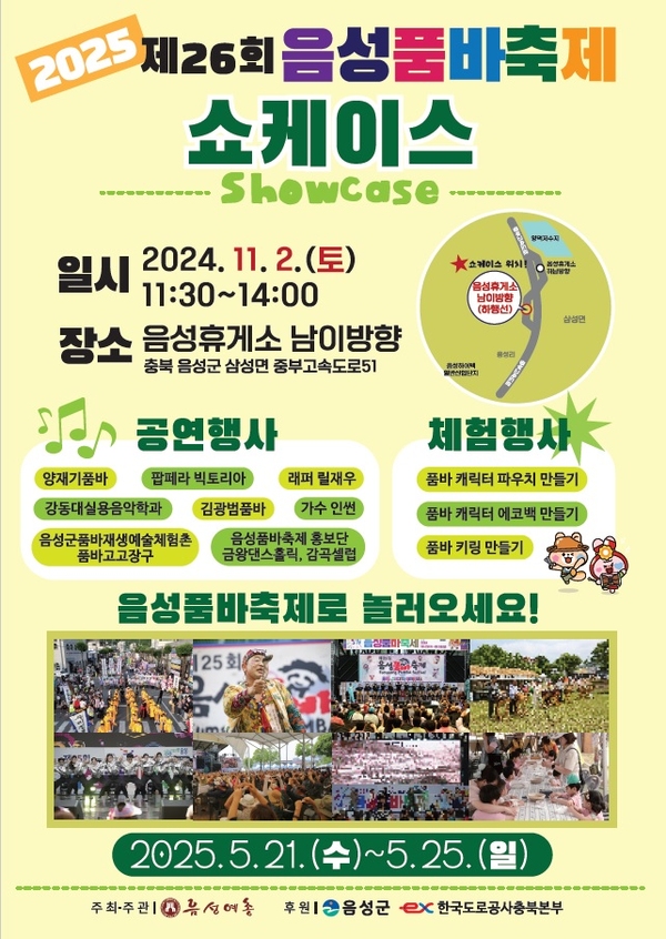 이날 쇼케이스에는 음성휴게소를 방문하는 방문객들에게 2025년 개최될 제26회 음성품바축제를 홍보하기 위해 품바캐릭터를 활용한 품바가방, 파우치, 키링 만들기 등 다양한 체험과 음성품바축제 퀴즈 룰렛 돌리기 이벤트를 준비했다.